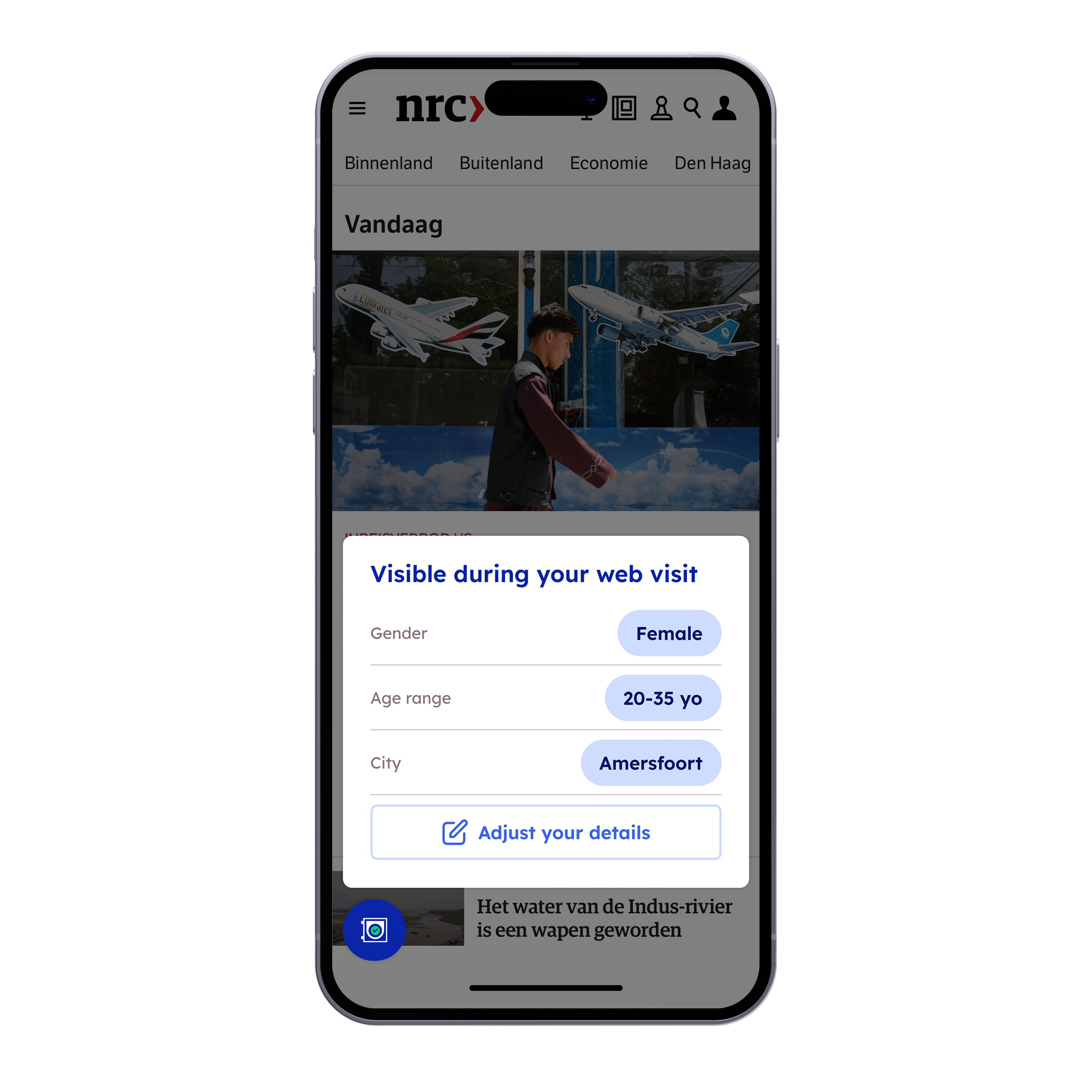 Your Upod does not contain your name, email address, or identity. Connected websites only receive anonymous data, and only during your visit. With your permission, they may use it to (hyper) personalise content, ads, services or agents, nothing more. You remain anonymous, while enjoying a more relevant experience. No profiles following you around. No surprises later.